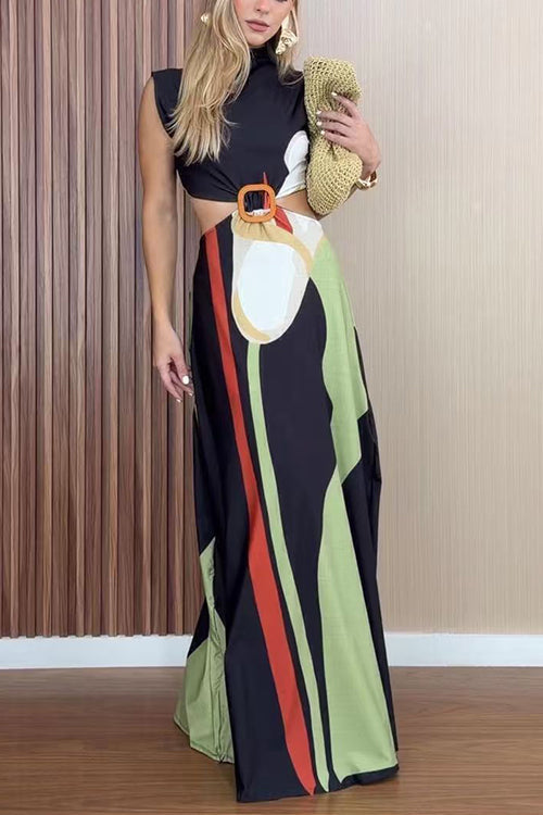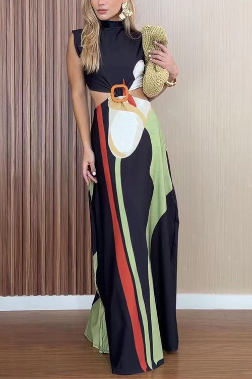 Meridress Mockneck Sleeveless Cut Out Waist Printed Maxi Dress