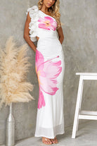 Frill One Shoulder Sleeveless Floral Print Bodycon Maxi Dress