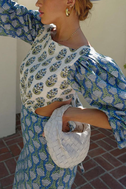 Meridress Lantern Sleeves Bow Back Cut Out Printed Midi Dress
