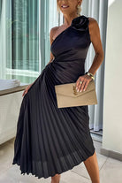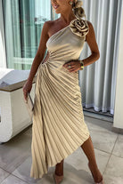 Indulge in the beauty of 3D roses with this one shoulder maxi dress. Featuring a cut out waist and an asymmetric hem, this pleated dress is a stunning and unique statement piece for any special occasion. Command attention and embody elegance in Meridress.