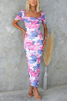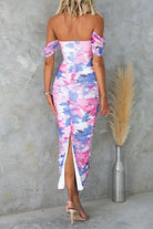 Off Shoulder Back Slit Ruched Print Maxi Dress