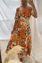 Introducing the ultimate summer must-have - the Off Shoulder Belted Ruffle Swing Printed Maxi Dress! With a flattering off shoulder design, a cinched waist for a perfect fit, and a flowy ruffled hem, this dress is perfect for any occasion. Elevate your style and turn heads with this stunning maxi dress!
