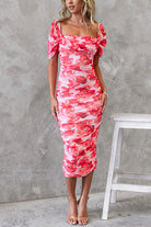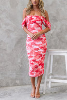 Off Shoulder Ruched Mesh Overlay Slim Fit Floral Midi Dress