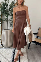 This stunning Strapless Pleated Faux Leather Midi Dress is the perfect blend of style and sophistication. The strapless design highlights your shoulders, while the pleated skirt adds movement and dimension. With its faux leather material, this dress exudes luxury and edge, making it a must-have for any fashion-forward individual.