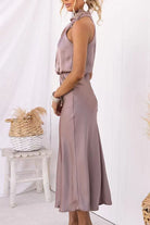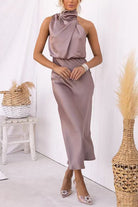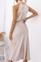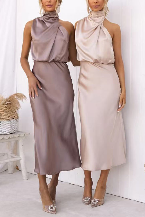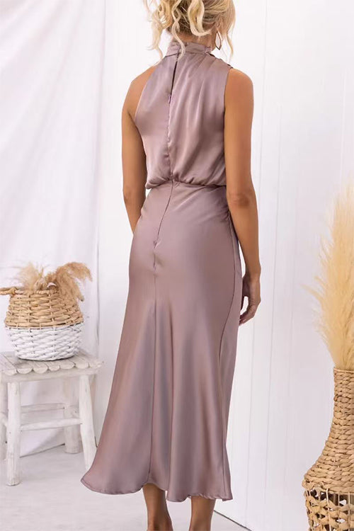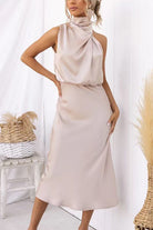 Elevate your wardrobe with this sophisticated High Neck Zipper Back Waisted Satin Midi Dress. Crafted from luxurious satin, this piece features a refined high neckline and a functional zipper back detail that adds modern elegance. The defined waist creates a flattering silhouette, while the midi length offers timeless versatility for both special occasions and elevated everyday wear.?