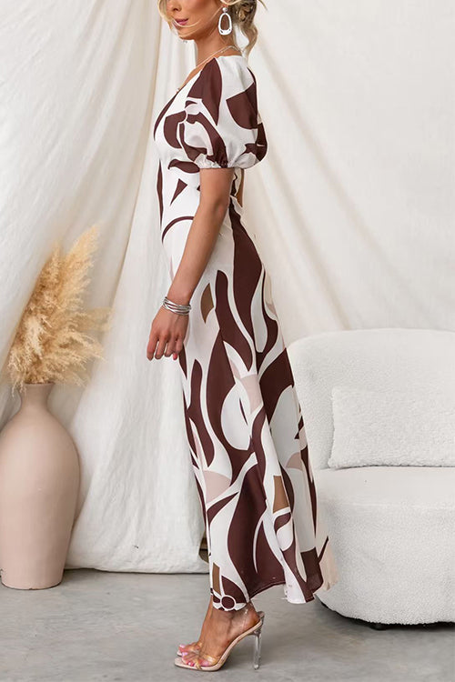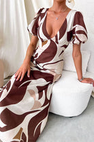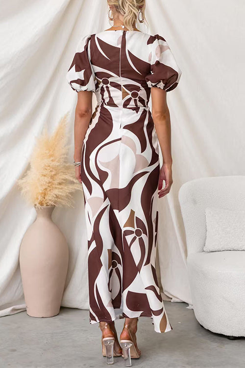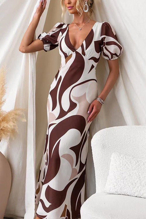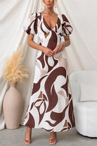 V Neck Puff Short Sleeves Printed Maxi Dress