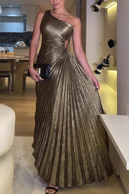 Discover elegance with the Meridress One Shoulder Sleeveless Maxi Dress. This stunning piece features a stylish cut-out waist that accentuates your figure, complemented by graceful pleats that add movement and charm. The one-shoulder design and sleeveless silhouette create a bold, contemporary look perfect for any upscale event or night out. Make a lasting impression with a dress designed to highlight your confidence and timeless style.