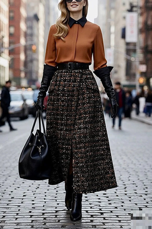 Lapel Button Up Color Block Blouse Shirt