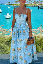 The Meridress Spaghetti Strap Waisted Floral Print A-line Maxi Dress beautifully combines a fitted waist with a flowing A-line silhouette to flatter your figure. Featuring delicate spaghetti straps and a vibrant floral print, this dress offers both comfort and style. Perfect for sunny days and special occasions, it ensures you look effortlessly elegant and feel confident all day long.