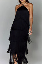 Introducing the ultimate statement piece for any party! The Meridress Chicest Halter Ruffle Layered Fringe Maxi Party Dress exudes confidence and elegance. With its chic halter neckline, stunning ruffle and fringe layers, and flattering maxi length, this dress is sure to turn heads and make you feel like a star. Be the talk of the event in this stunning dress!