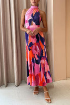 Meridress Halter Backless Cut Out Printed Maxi Pleated Dress