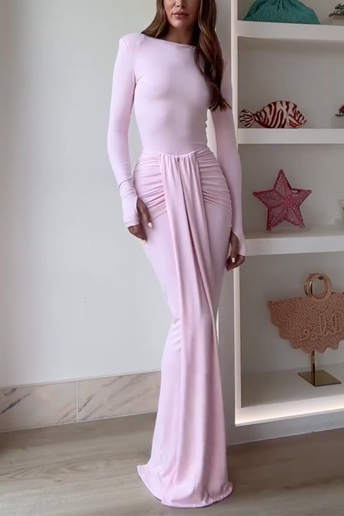 V Neck Long Sleeves Pocketed Ruched Slit Maxi Dress