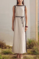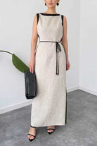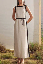 Elegant boat neck sleeveless maxi dress featuring a graceful back slit for effortless movement and modern style. Crafted from a comfortable cotton and polyester blend, this versatile piece transitions seamlessly from day to evening wear. The flattering neckline and flowing silhouette create a sophisticated look perfect for any occasion.?