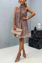 Meridress Halter Sleeveless Feather Hem Sequin Dress