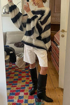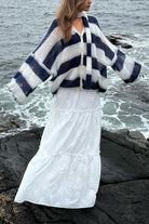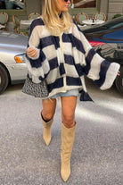 Unleash your fashionable, confident and bold side with our Meridress Lantern Sleeves Button Down Color Block Stripes Sweater with Scarf. Trendy lantern sleeves, a stylish button down design and striking color block stripes, paired with a matching scarf, creates an effortlessly chic and put-together look. Take your style game to the next level today!
