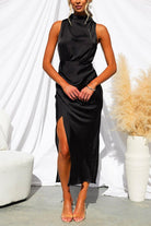 Meridress Turtleneck Sleeveless Waisted Slit Midi Satin Dress