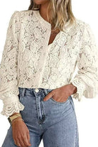 • Elevate your wardrobe with this enchanting ruffle long sleeve lace shirt. Delicate lace detailing combines with romantic ruffled sleeves to create an effortlessly sophisticated look that transitions seamlessly from office to evening. The classic button-up design offers versatile styling options¡ªwear it solo for a statement piece or layer it under your favorite blazer. Perfect for anyone seeking to add feminine elegance and timeless charm to their everyday collection.