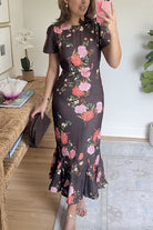 Crewneck Short Sleeves Floral Print Ruffle Hem Midi Dress