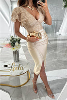 Dazzle in our Meridress V Neck Flare Sleeves Slit Bodycon Sequin Midi Dress! The deep V neck, flared sleeves, and sexy slit elevate the classic bodycon silhouette, while the sparkling sequins add a touch of glamour. Perfect for a night out, prom, or any special occasion.