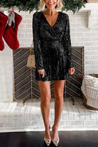 V Neck Long Sleeves Waisted Sequin Mini Wrap Dress