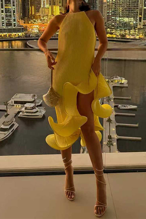 This sleeveless midi dress redefines modern elegance with its signature irregular ruffle hem¡ªa design detail that transforms an everyday silhouette into something truly memorable. The asymmetrical ruffles add texture and movement, creating visual intrigue that photographs beautifully and commands attention in any room. Crafted for the woman who values both comfort and impact, the sleeveless cut provides breathability while the midi length offers timeless versatility. Layer it with a blazer for professional polish or wear it bare-shouldered for evening allure. This is the dress you'll reach for again and again¡ªthe one that makes you feel confident, stylish, and undeniably yourself.
