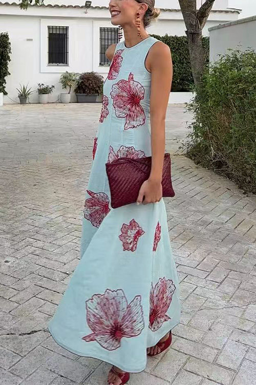 Effortless elegance meets timeless style with this Crewneck Sleeveless Floral Print Maxi Dress. The lightweight cotton-polyester blend offers comfort and breathability, perfect for warm weather occasions. The classic crewneck and sleeveless design provide a flattering silhouette, while the flowing maxi length creates a graceful, sophisticated look. Ideal for casual outings, garden parties, or relaxed evening events. Available in sizes S to XL with detailed measurements to ensure the perfect fit.