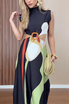 Elevate your wardrobe with this stunning mockneck sleeveless maxi dress, featuring a chic cut-out waist detail and eye-catching printed design. Crafted from a comfortable cotton-polyester blend, this dress offers the perfect balance of style and breathability for any occasion. The sleek silhouette flatters your figure while the strategic cut-out adds modern sophistication. Whether you're dressing up for an event or keeping it casual, this versatile piece transitions effortlessly from day to night.?