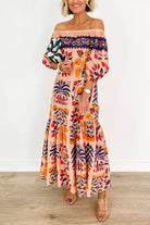 Meridress Off Shoulder Lantern Sleeves Printed Ruffle Maxi Dress