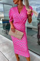 Meridress Wrap V Neck Puff Sleeves Printed Midi Bodycon Dress