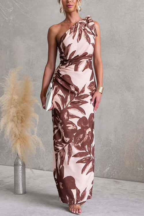 Asymmetrical Shoulder Ruched Floral Print Maxi Dress