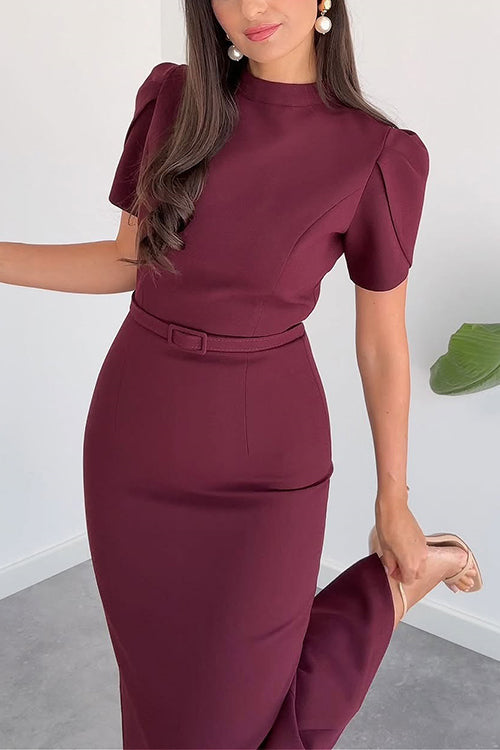 Mockneck Puff Short Sleeves Back Slit Midi Dress