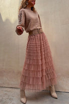 Feel beautiful and feminine in the tulle layered ruffle mesh maxi skirt. Its delicate design and layers of tulle are sure to capture the attention of everyone in the room. Perfect for special occasions or dressed down with a tee or blazer for everyday. Bring a unique and elegant touch to your wardrobe with this show-stopping skirt!
