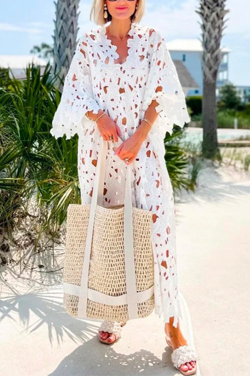 V Neck Hollow Out Eyelet Lace Beach Cover Up Dress