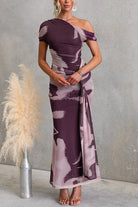Asymmetrical Shoulder Draped Front Printed Maxi Dress