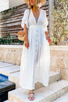 Deep V Neck Drawstring Waist Button Down Maxi Beach Cover Up Dress