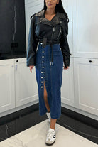 Meridress Button Down Slit Midi Denim Skirt